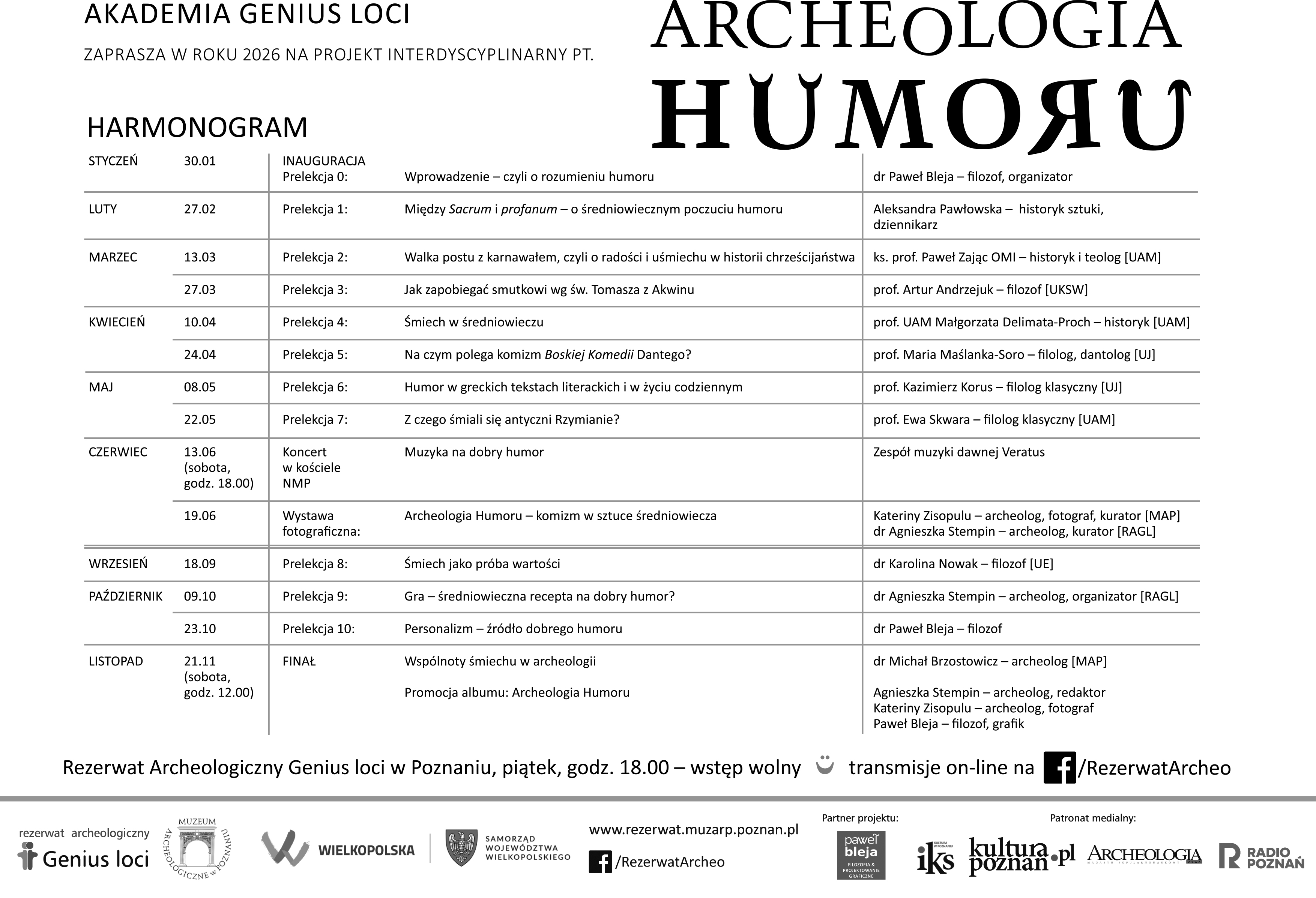 Program pt. „Archeologia humoru” jest kontynuacją przedsięwzięć realizowanych w Rezerwacie Archeologicznym Genius loci od 2017 roku pod wspólnym tytułem Akademia Genius loci. W roku 2026 zapraszamy zwiedzających do poznania cywilizacji europejskiej z perspektywy zjawiska humoru, który zgodnie z sentencją średniowieczną „ciałom śmiechu przyda, duszom sił przysporzy”. W etyce Arystotelesa eutarpelia, czyli taktowny dowcip, stanowił cnotę złotego środka odróżniając się i odcinając od zjawisk takich jak błazeństwo, czy nieokrzesanie. Archeologię natomiast pragniemy traktować jako metaforę poszukiwania wiedzy. Humor pełnił wielorakie funkcje, wśród których jedną z najistotniejszych była rola poznawcza, humor zawsze był skutecznym źródłem higieny psychicznej, a dziś dostrzega się jego wartości terapeutyczne. Zapraszamy gości Rezerwatu Archeologicznego Genius loci w podróż po zmiennościach przejawów humoru na przestrzeni wieków od starożytnych Greków i Rzymian po kształtowanie współczesnego poczucia humoru i jego wartości w życiu codziennym na poziomie osobowym i społecznym.
